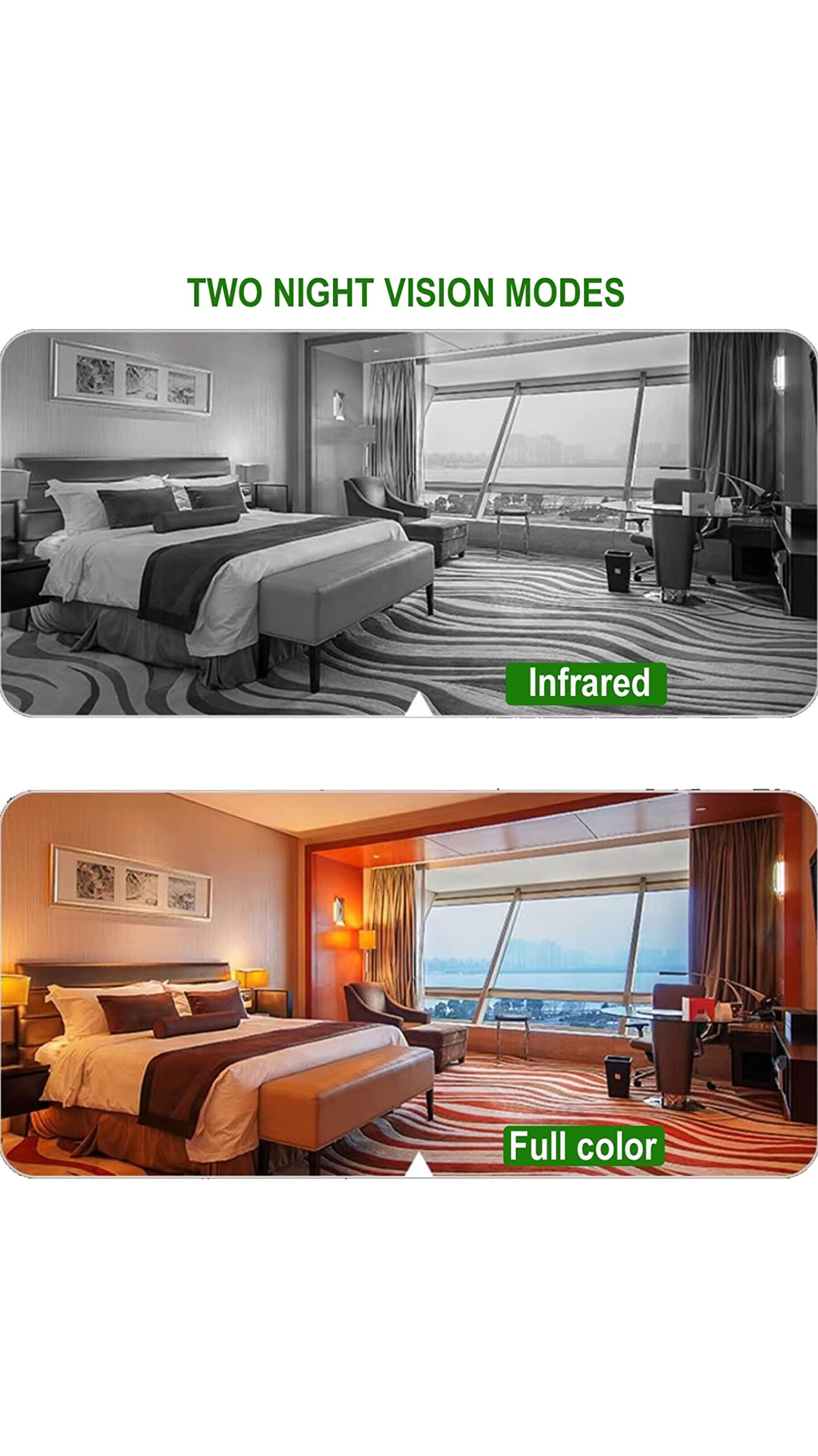 • Full Color Mode: When motion is detected, the bright white LEDs turn on, providing clear color video and illuminating the area for better visibility.